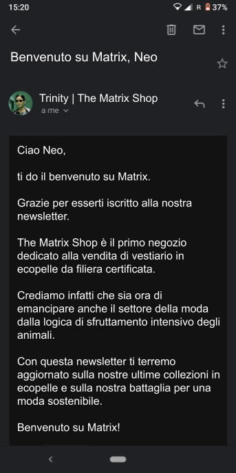 Una persona che si registra alla newsletter dal sito dimostra un interesse principalmente informativo e probabilmente non è pronta all’acquisto. Per cui potrebbe ricevere questa mail: